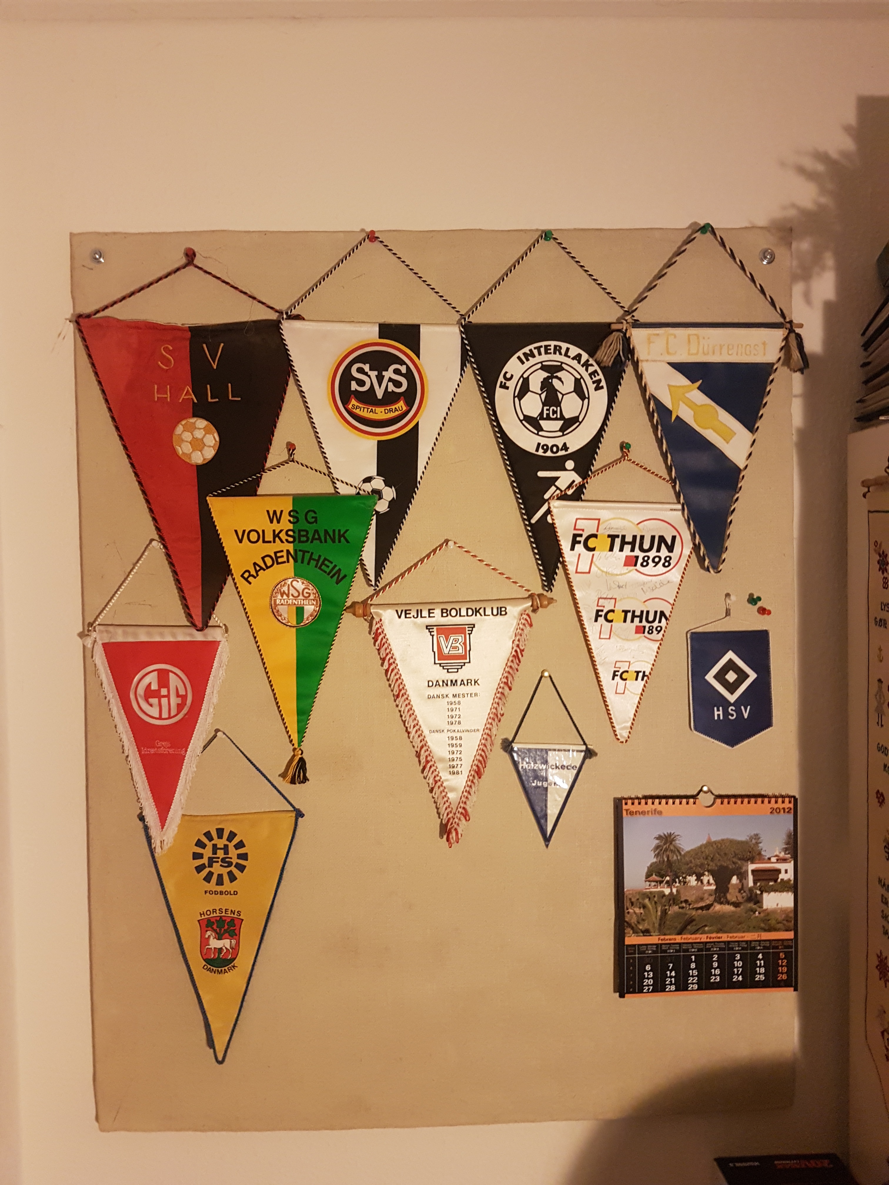BILLEDTEKST3: Vimplerne på væggen er det fysiske bevis på de mange træningsture til blandt andet Norge, Tyskland og Østrig.